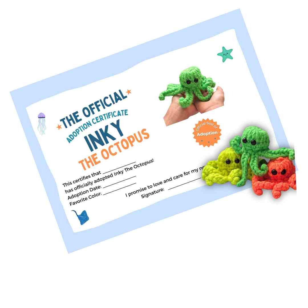 - This “Certificate of Adoption” is the perfect addition to your Inky the Octopus crochet gift.