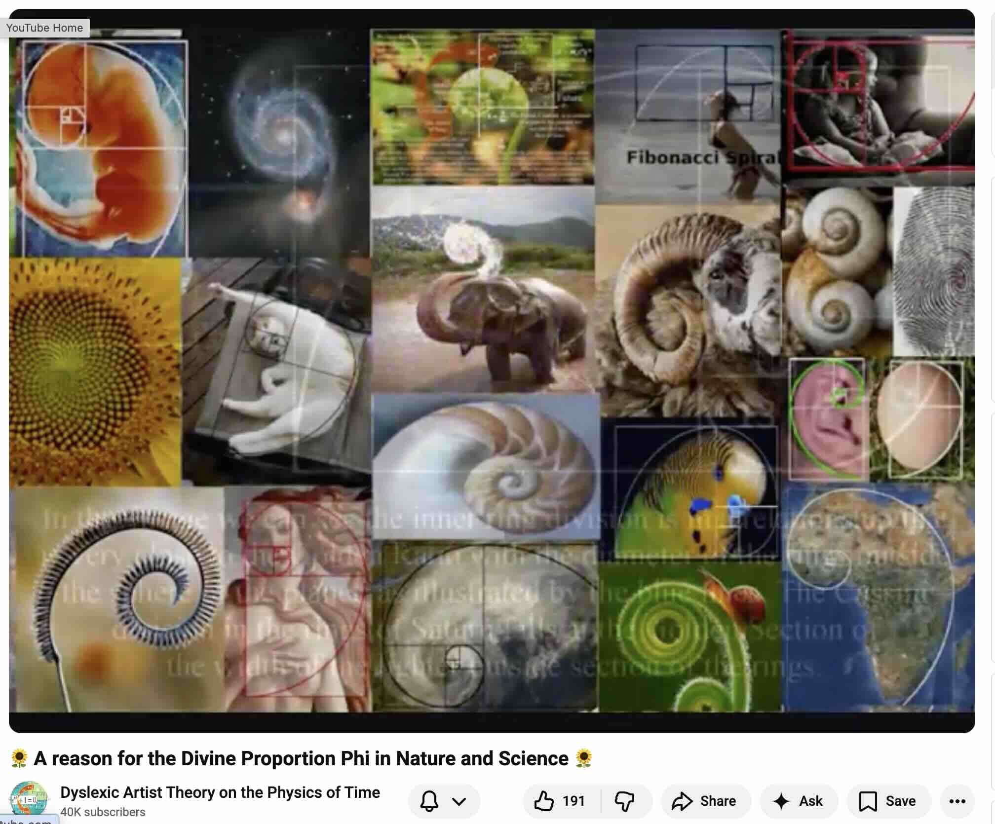 If you'd like to get more detailed information on the Fibonacci Spiral, with ind-depth mathematical explanation, here's a really interesting video by "Dyslexic Artist Theory on the Physics of Time".